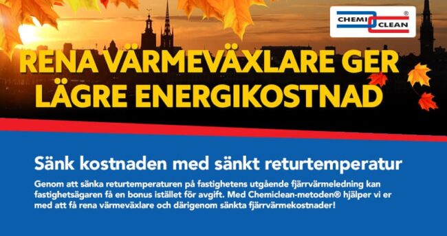 Genom att sänka returtemperaturen på fastighetens utgående fjärrvärmeledning kan fastighetsägaren få en bonus istället för avgift. Med Chemiclean-metoden® hjälper vi er med att få rena värmeväxlare och därigenom sänkta fjärrvärmekostnader!